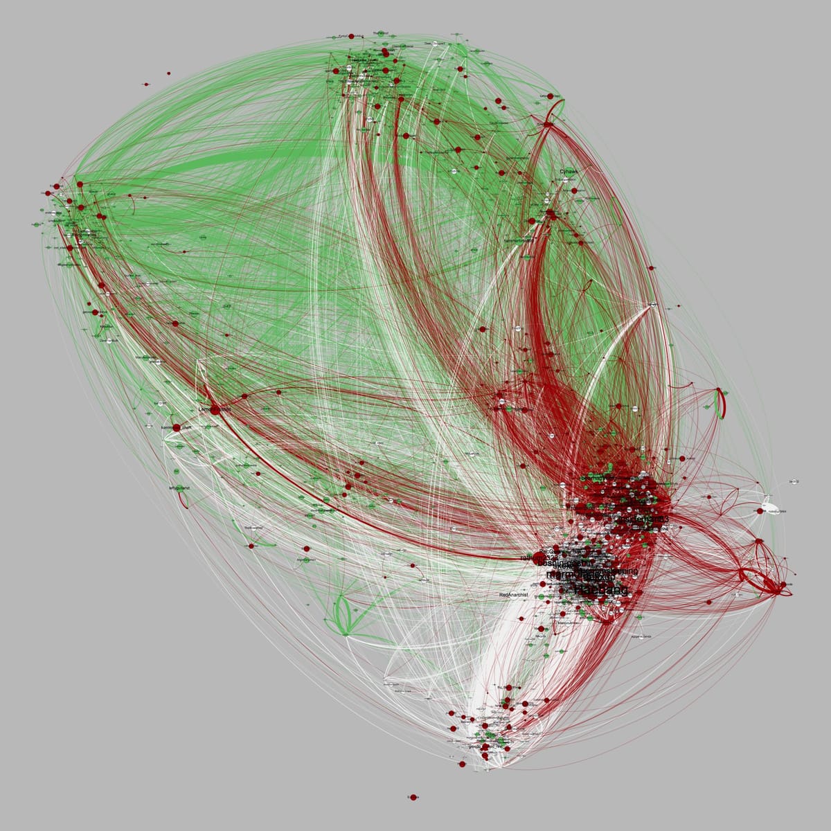 1.MensRights and TheRedPill are more tightly coupled than KotakuInAction: MensRights is Grayish-White, TheRedPill is red, and KotakuInAction is green (meaning a node is colored (or assigned to their most-participated subreddit) by the highest post count for that nodes post history). What results is a clearly stronger relationship between these two subreddits (though it should be noted that MensRights and TheRedPill are both roughly twice-three times as large as KotakuInAction, so assuming this relationship is meaningful right out of the gate is probably open to skepticism.